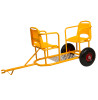 Anhæger til transport af to børn. Med anhængertræk, og standard MC-tilkoplingsanordning, så man har mulighed for at lave et langt tog. Trolleyen er designet således at selv mindre børn (3år) ikke let falder ud.
