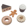 Flotte kager og småkager fremstillet i træ. Trælegetøjet er beregnet til rollelege og som-om-lege og vil inspirere barnet til at lege kok, butik, tjener eller picnictur.