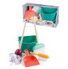 Sættet er i en god kvalitet og består af en spand, gulvmoppe, en stor kost, en fejebakke og en lille kost, samt skemaer.