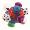 En blød bold med mange små og sjove elementer såsom bløde knopper og gennemsigtige knopper med små kugler i.