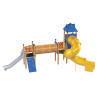 Et exceptionelt legesæt med to rutsjebaner - en lav metalrutsjebane og en høj tunnelrutsjebane - designet specielt til børn i førskolealderen. Dette sæt udfordrer unge brugere til at vise koordination, styrke og smidighed, da det mangler traditionelle trapper. For at nå rutsjebanerne skal børnene klatre op ad en klatrevæg og navigere over en tunnelbro. Når man planlægger en legeplads, er det vigtigt at overveje miljøfaktorer. For eksempel kan placering af legesættet, så metalelementer, såsom rutsjebaner, vender mod nord eller placeres i skyggefulde områder, hjælpe med at forhindre overophedning i solskinsvejr. Denne gennemtænkte opsætning sikrer både sjov og sikkerhed for unge eventyrere.