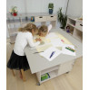 Multifunktionsbord til de små kreative børn. Bordet er et materiale/beskæftigelsesbord, spisebord mm. Bordet har opbevaringsplads, hylder skab og skuffer. Efter en tur i naturen kan børnene belyse f.eks. forskellige blade og insekter, som de har indsamlet. i fællesskab med personalet kan børnene opskære planter og smådyr og gennemlyse dem. En anden mulighed er, at bruge lysbordet til overførsel af forskellige tegne-motiver. Læg papiret på lyspladen og du kan tegne og male.