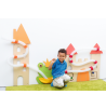 Stor væg-aktivitetstavle med borgtema, med en lang rørbane fastgjort med farverig velcro.