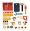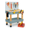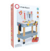 Værktøjsbænk i træ med et væld af tilbehør som for eksempel værktøjskasse, rundsav, hammer, svensknøgle, skruetrækker, bolte og møtrikker til den gode rolleleg.